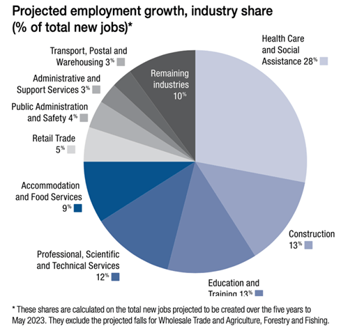 从澳洲政府发布的《Australian Jobs 2019》报告看,到2023年,Health Care and Social Assistance健康服务和社会支持领域内的工作机会增长占比为28%,远高于排名第二的Construction建设领域(13%)和排名第三的Training and Education培训和教育领域(13%),更高于专业服务领域,诸如金融服务、科技服务等。