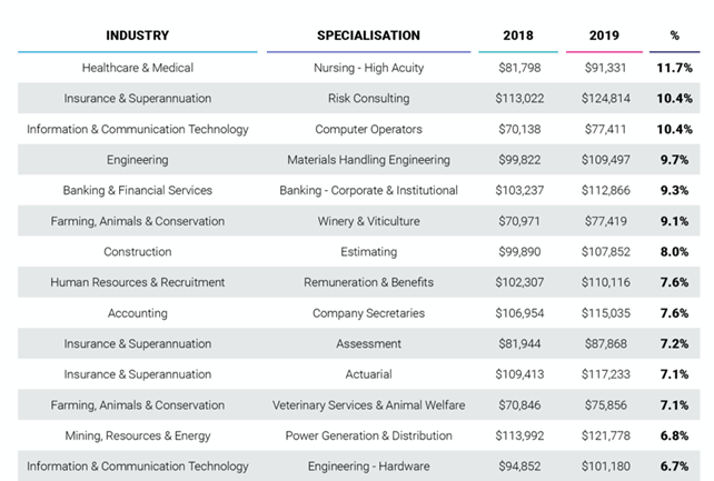从Seek发表的薪酬报告中看到,健康和医学领域特别是护理专业的薪酬涨幅名列前茅,护理专业的年薪涨幅高达11.7%,位列全部专业第一位,高于传统金融领域和工程领域的相关专业,比如风险管理、计算机运营、银行服务等。