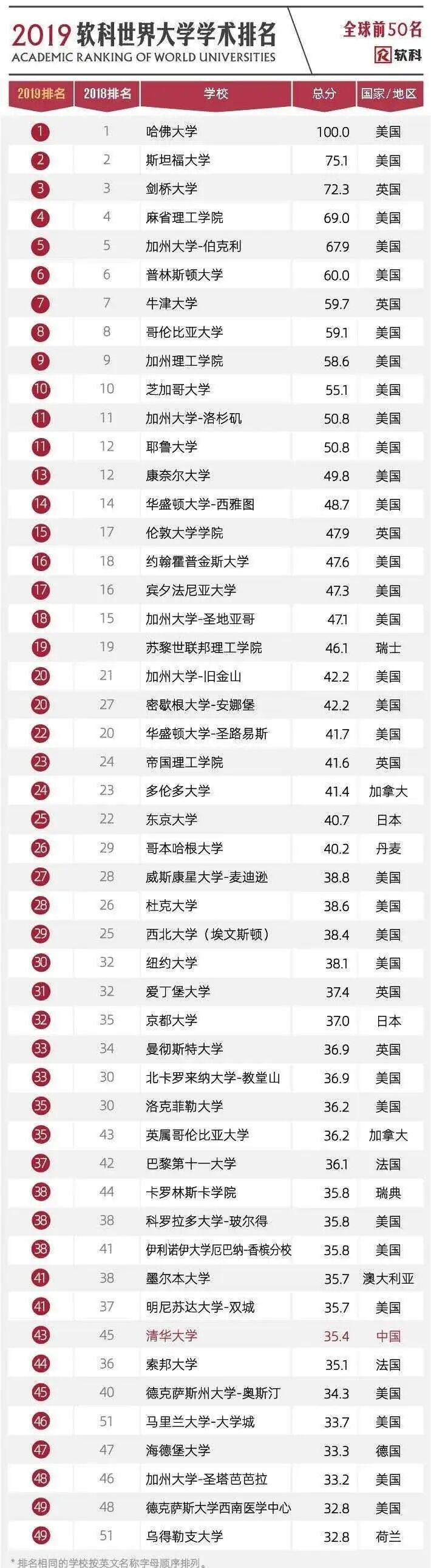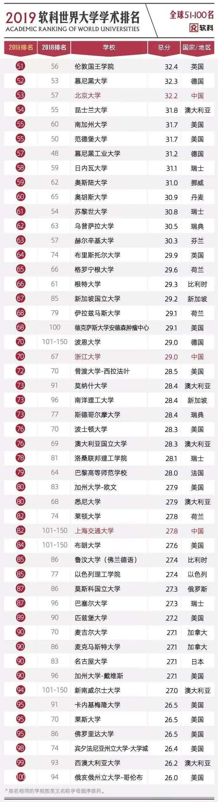 看完了2020中国大学排名后,我们和最新的软科世界大学排名做一个横向对比。下图是软科世界大学学科排名的前一百名,我们能看到中国大学前三清华大学、北京大学、浙江大学分别在45名、53名、70名。