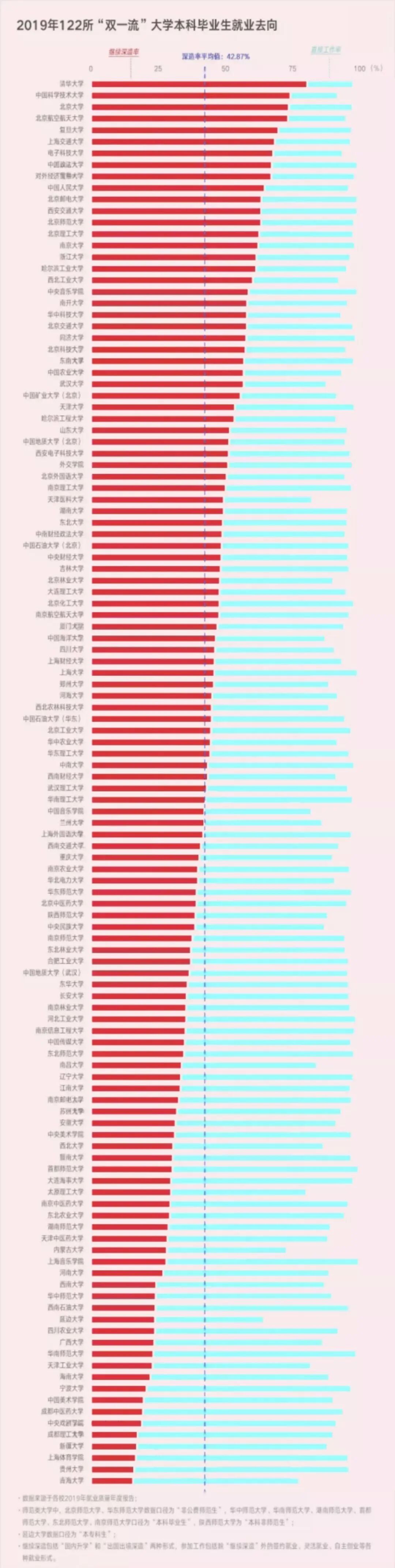 而下图根据各校2019年度就业质量报告所呈现的122所“双一流”大学本科升学率,平均达到了42.87%。