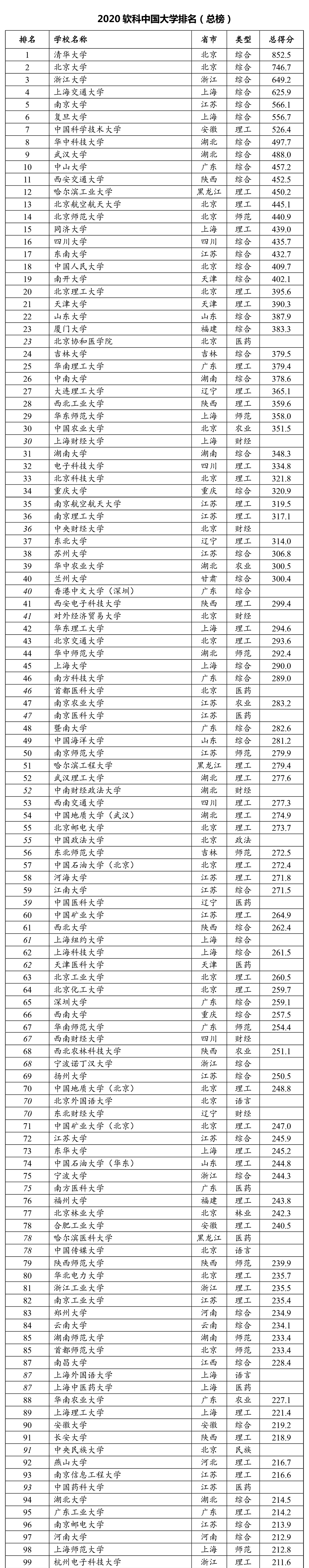 2020软科中国大学排名(主榜)的上榜高校共有567所,清华大学、北京大学、浙江大学占据前三,上海交通大学位列第四,南京大学凭借在人才培养模块的卓越表现,综合实力跻身全国前五。