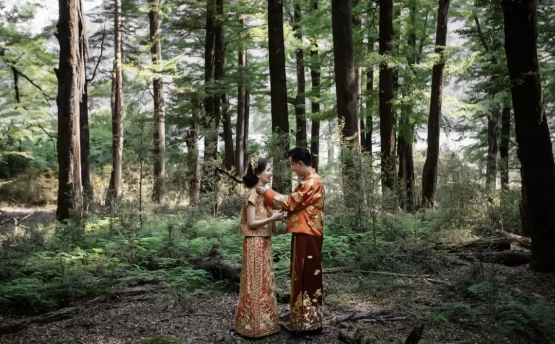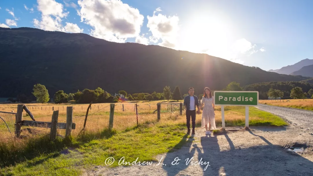 婚礼地点树木丛生,宁静怡人,是新西兰的小众景点——距离皇后镇1小时车程的格林诺奇天堂镇。景点虽小众,名称可起得寓意美好,让人迷之向往。