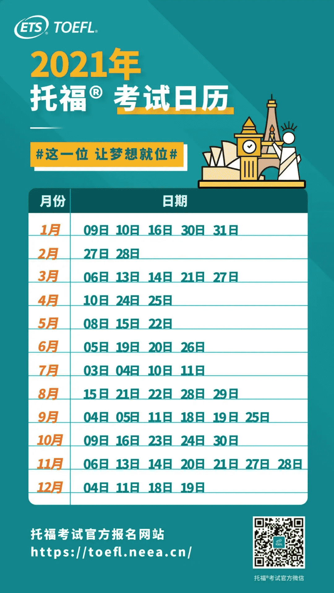 2021年托福考试暂计划开放30个考试日期,具体排期如下: