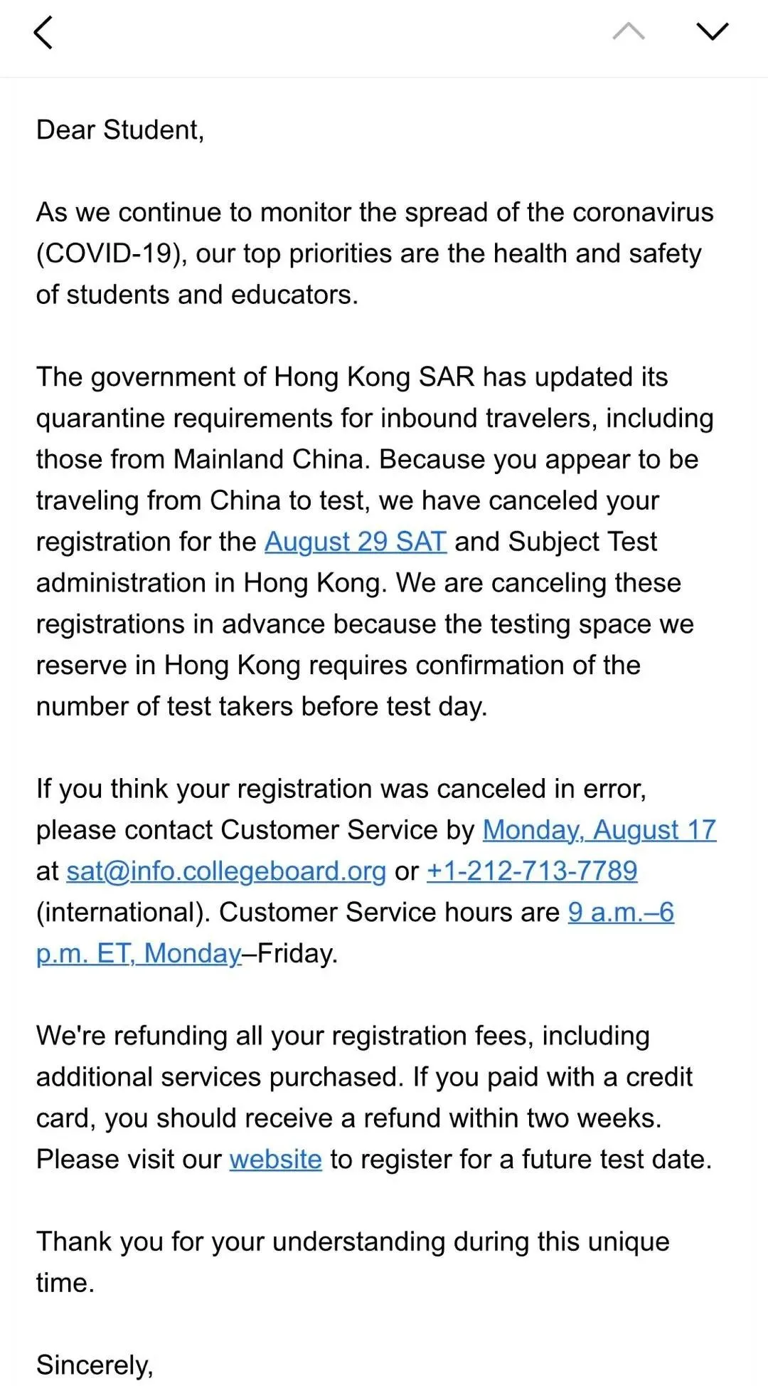 虽然早有预感,但这可能也是正式宣告,8 月大陆同学想去香港考 SAT 的计划已经落空。