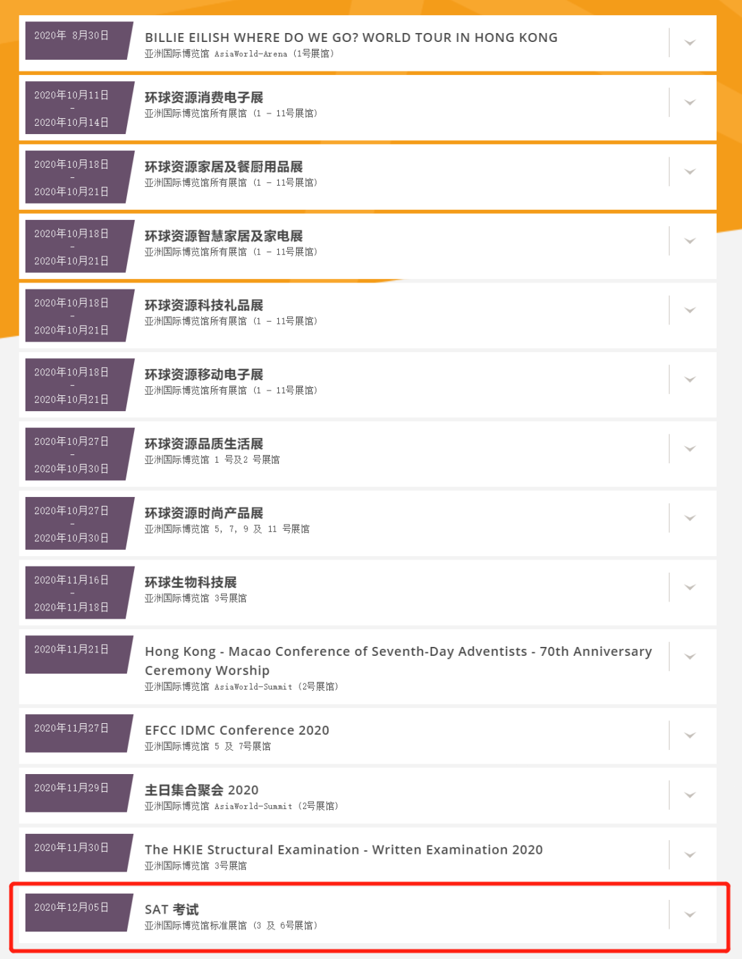而且更令人担忧的是,香港考场可能取消的不仅仅是 8 月这一场。小编今天登陆了香港亚博馆的网站,从其活动安排上可以看到,9 月、10 月的考试安排也都已经下线,目前只可以查看到 12 月 5 日这一场考试。