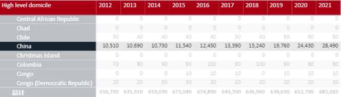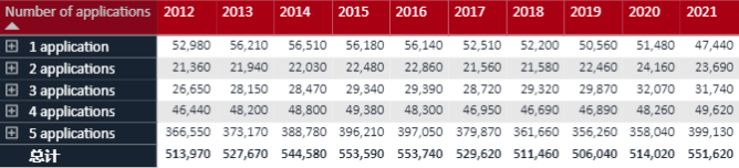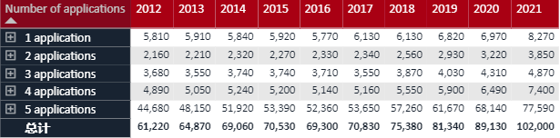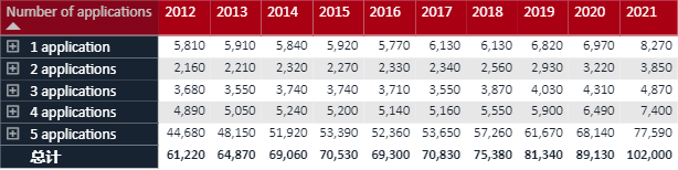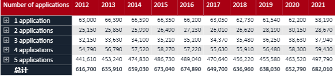 近几年英国本土的申请量一直较稳定,在50万到55万之间浮动,这也与英国本身的人口规模有关。