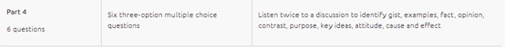 第四部分6个问题,六个可以3选的多选题,可以听两遍,找出要点、例子、事实、观点、对比、目的、关键思想、态度、因果关系。