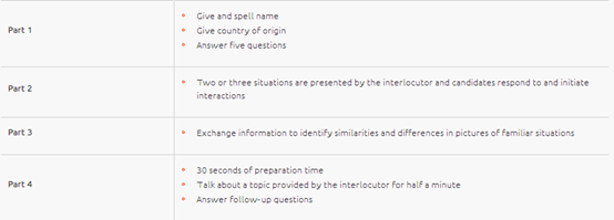 共13分钟。分为四部分。第一部分包括给出姓名和拼读,考生所在国家地区和五个小问题,第二部分是2-3个随机问答题,第三部分为对于图像或常见现象的异同描述和信息交换,第四部分最难,考官提出一个话题,考生准备30秒后进行口语阐述并回答一系列相关问题