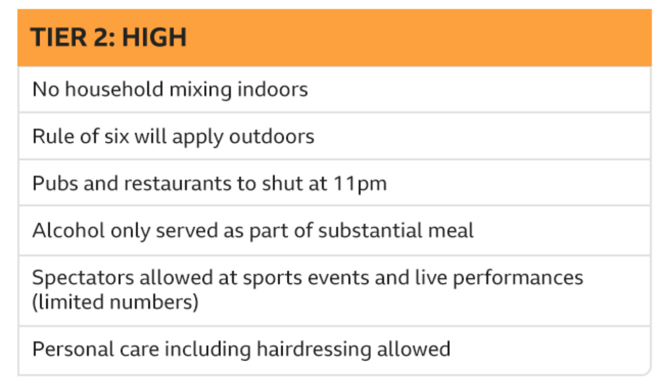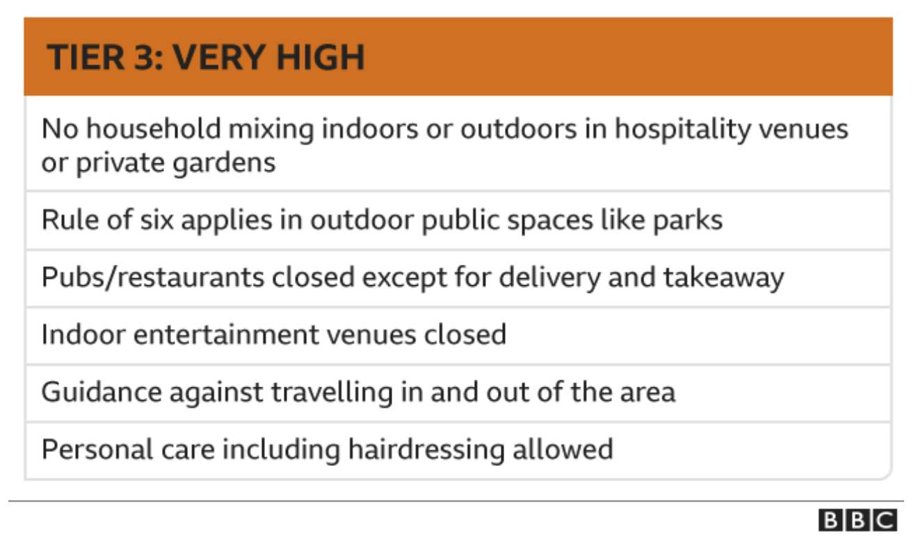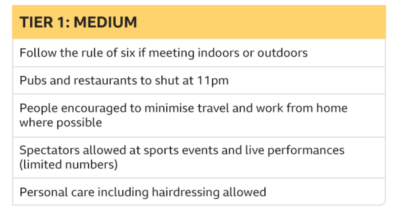 12月2日后,政府将会根据各地区的病例数,新冠感染率(R值),当地NHS的应对能力等等,对各地区进行分级,层级的分类将每14天审查一次。总共会分为三级,每一层级有不同的限制措施。