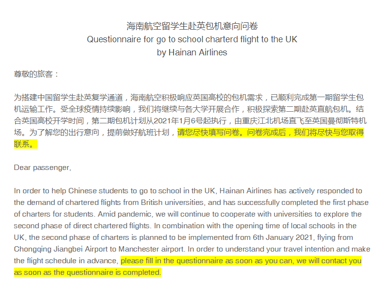 阿伯丁大学也发布了「2021年1月包机意向调查」。阿伯丁大学表示,考虑到明年1月同样是入学的高峰期,学校已经同海南航空就包机计划进行了协商。