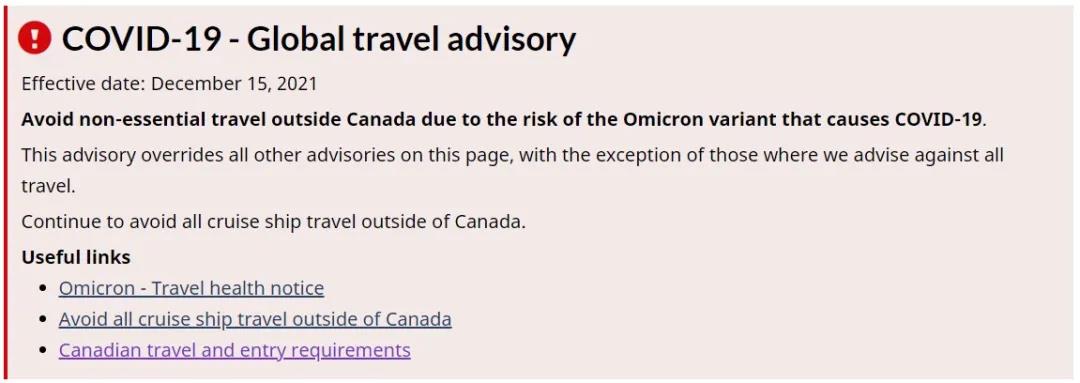 自去年12月中旬出现COVID-19的Omicron变种病毒后,加拿大联邦政府建议国民不要进行非必要的国际旅行。