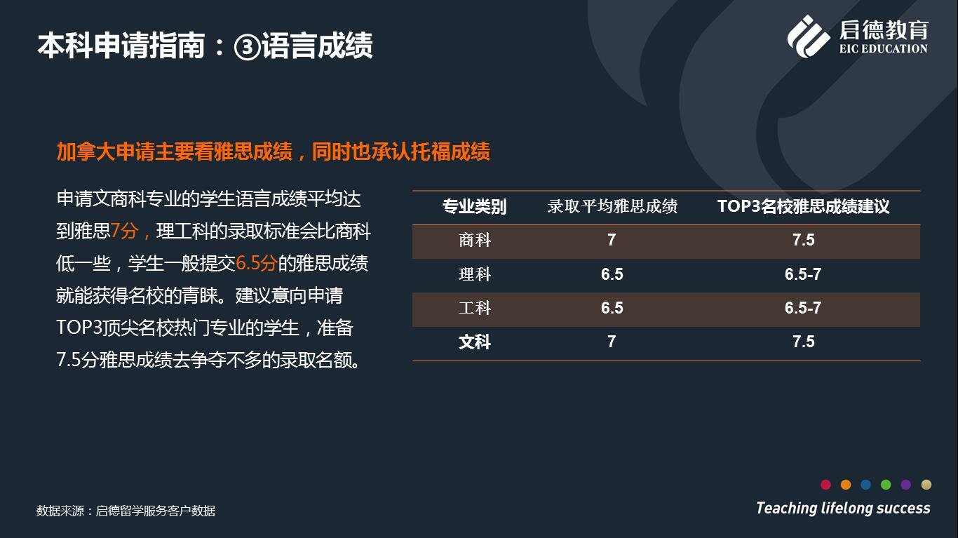 除了学术成绩以外,申请商科专业的学生语言成绩平均需要达到雅思7 分,最终获得麦吉尔大学、多伦多大学、英属哥伦比亚大学热门专业录取的学生雅思分数大多达到7.5 分。理工科的录取标准会比商科低一些,学生一般提交6.5 分的雅思成绩就能获得名校的青睐。文科方面由于课程有更多英语论文写作要求,所以入学时对学生的英语能力要求也比较高,达到7 分。启德建议意向申请名校热门专业的学生,准备7.5 分优异雅思成绩去争夺不多的录取名额。