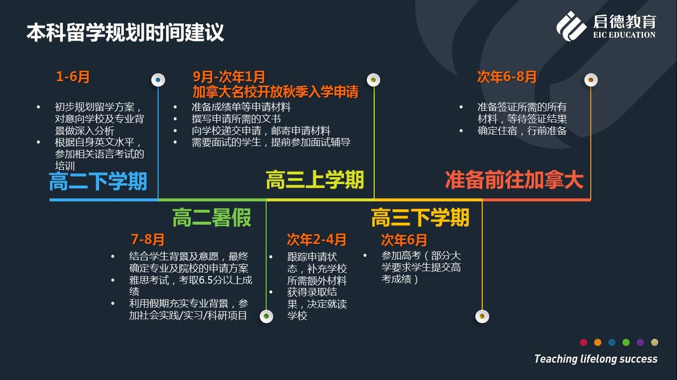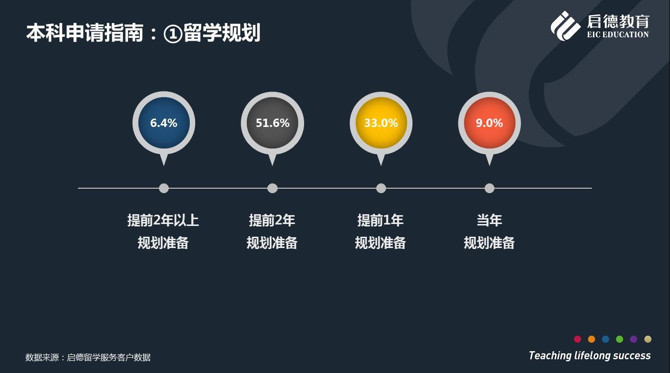《启德教育2018加拿大留学报告(本硕篇)》显示,根据签约启德留学服务时间统计,超过9 成学生提前1 年以上为加拿大本科申请做准备,其中提前2 年以上开始准备的学生占6.4%,这部分学生主要为了冲刺加拿大TOP3 名校,利用高中2-3年时间提升硬件实力及软件实力。留学当年才开始准备的学生,由于大学申请时间在1-3 月陆续截止,很多学生来不及准备语言考试,2/3 学生只能申请双录取,入读语言课程或桥梁课程。