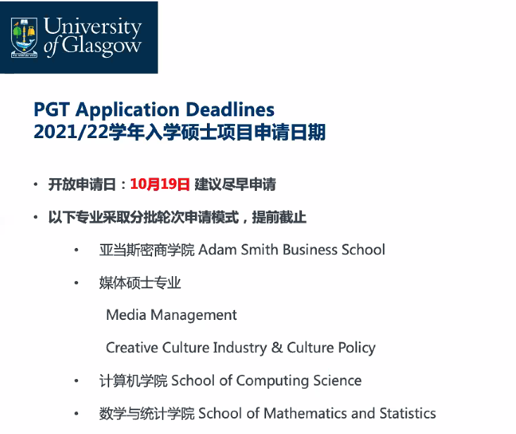 格拉斯哥大学亚当斯密商学院已于11月15日关闭第一轮申请。同时,格拉斯哥大学亚当斯密商学院还强烈建议国际学生在12月15日之前提交申请。