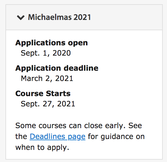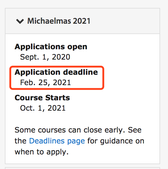 其中,MPhil in Management及Mphil in Finance两个专业截止时间最早,将于2月25日截止申请。