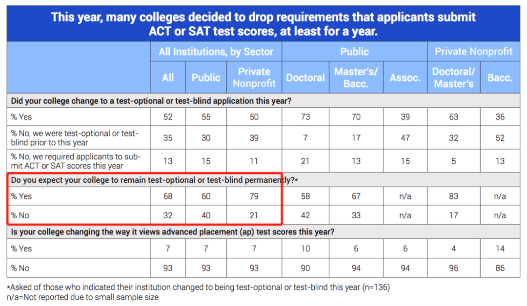 针对这一问题,高等教育新闻网站 Inside Higher Ed 做了一次系统性的调查,对象涵盖全美 400 多所大学。调查结果显示,68% 的高校招生办工作人员认为自己的学校会永久性保持 Test Optional 或 Test Blind 政策,公立大学占 60%,私立大学占 79%。