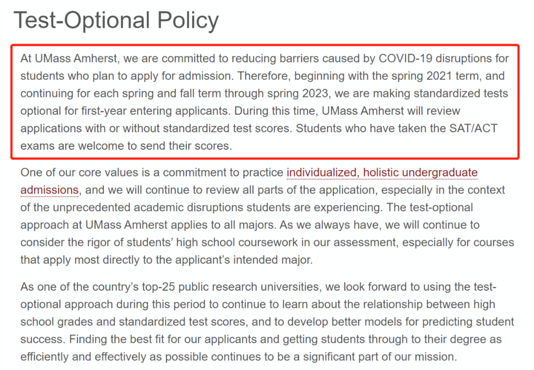 疫情显然促使了更多的美国大学进行类似的思考,也开始做出一些尝试。在今年宣布采用 Test Optional 政策的学校中,有一小部分学校(比如马萨诸塞大学阿默斯特分校、塔夫茨大学)将该政策的时间限定设为三年,其主要目的就是为了在接下来的三个录取周期内收集数据,以确定未来学生是否将从永久性的标化可选政策中受益。