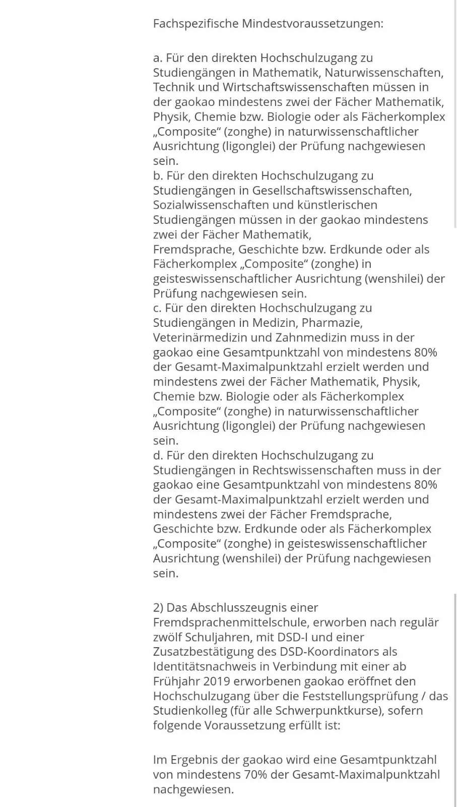 全德国范围内所有高等院校的大门已经为中国高中毕业生打开,有高考成绩的高中毕业生将拥有德国大学本科的直接入学资格(Hochschulzugang)。