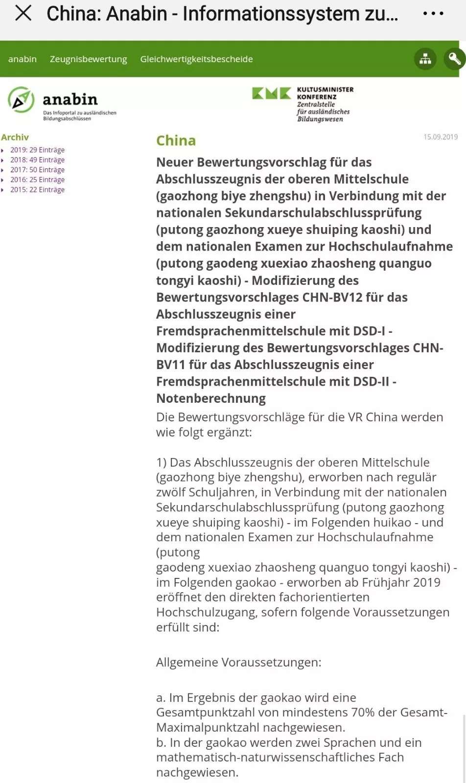 德国各邦文教部长常设会议(Kultusministerkonferenz;KMK)公布了新的对中国高中毕业证书、普通高中学业水平考试和普通高等学校招生全国统一考试评定的建议!!!