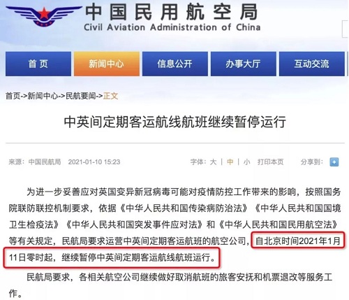 此前,民航局曾宣布,自2020年12月28日至2021年1月10日,中英间航班停飞14天。本周,中国民用航空局再次官宣:自北京时间1月11日零点起,继续暂停中英间定期客运航线航班运行。