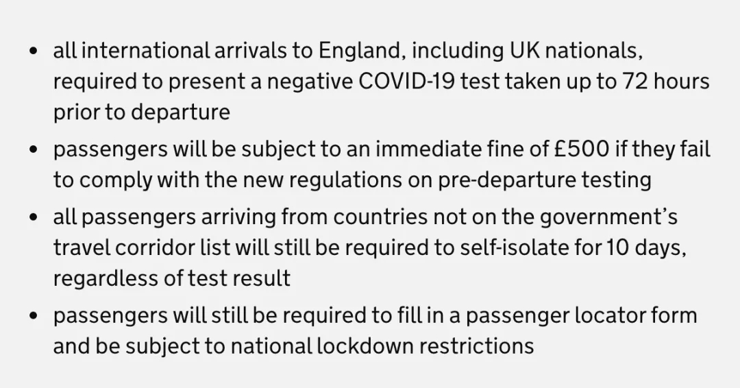 无论是否拥有核酸检测证明,所有来自“旅行走廊”(Government's Travel Corridor List)以外国家和地区的旅客抵英后仍需自我隔离10天。(来自中国的旅客适用于此条,来英后需自我隔离10天)