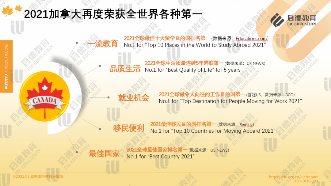 根据《2021加拿大启德留学报告》显示,2021年加拿大荣获了不少世界第一的头衔,综合性价比超高。