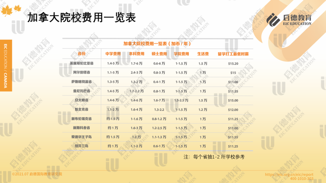 根据《2021加拿大启德留学报告》的数据显示,加拿大本科院校费用1.3万-6万加币/年,硕士则在0.6万-2.2万加币/年,每年生活费1万-1.5万加币。综合来看,加拿大留学的费用基本在工薪家庭可以接受的范围之内。而且加拿大是允许留学生打工的,再加上各种退费政策,加拿大留学生们学习生活的负担也会相对较小。