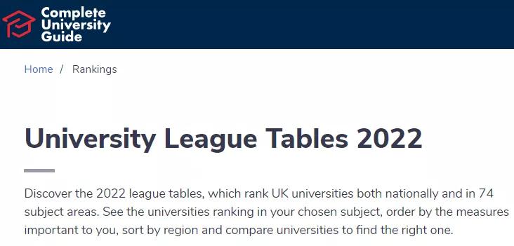 CUG全称为Complete University Guide(即《完全大学指南》),与《卫报》、《泰晤士报》并列为英国三大权威排名。
