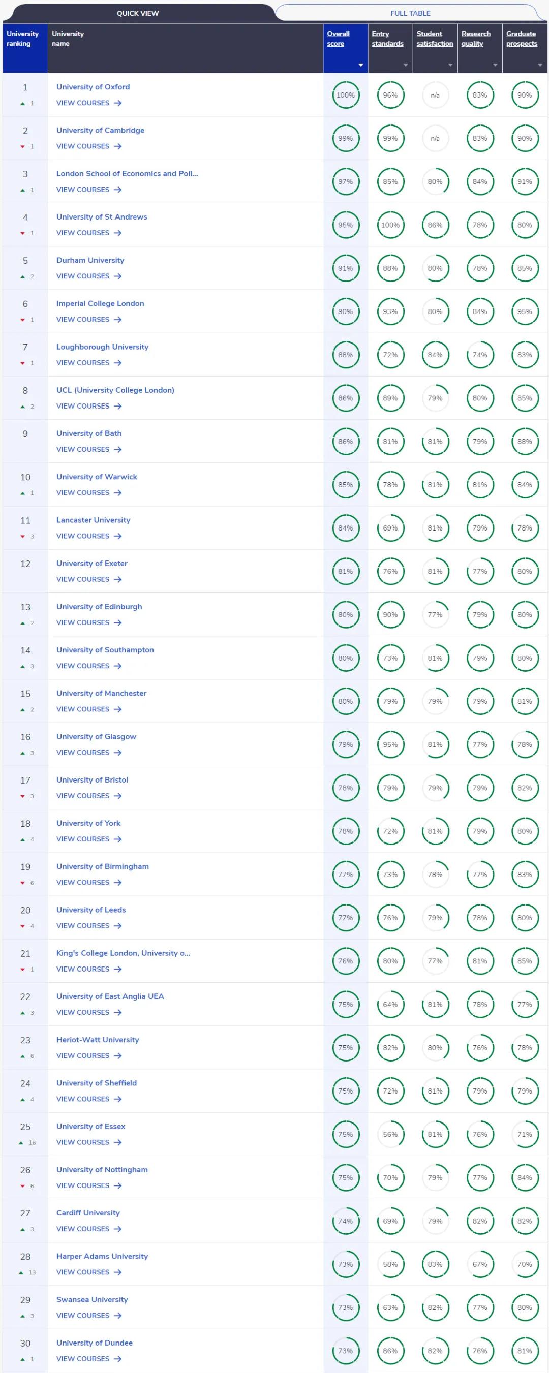 牛津大学“战胜”剑桥大学,名列第1,伦敦政治经济学院与圣安德鲁斯大学互换位置,分别位列第3名和第4名,杜伦大学上升2个名次,进入TOP5的行列。