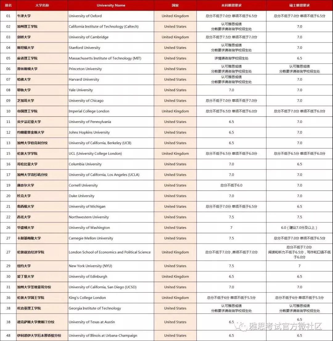 下表是2020THE排名TOP50里面的英美院校和雅思成绩要求,供大家参考: