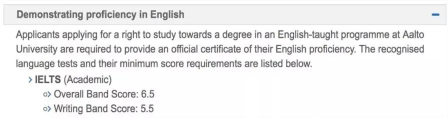 在芬兰开设英语课程的大学里,阿尔托大学要求雅思总分不低于6.5分,写作不低于5.5分。