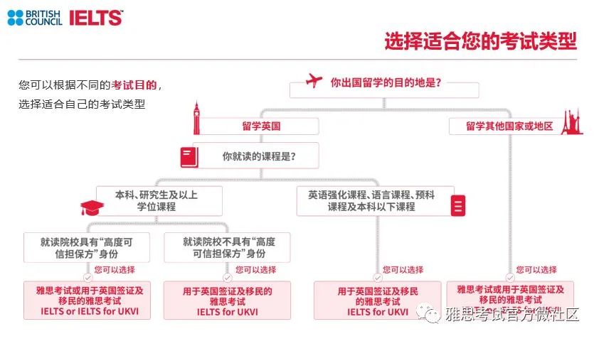 另外,提示大家,有可能会需要用到用于英国签证及移民的雅思考试成绩哦,至于具体你需要选哪种,请参考下图:
