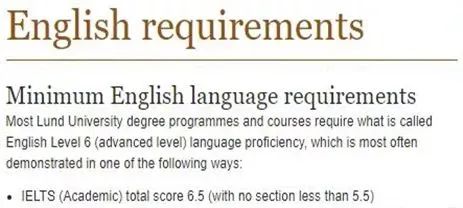 对于英语授课的课程来说,瑞典学校对语言的平均要求为雅思成绩不得低于6.5分,单项不低于5.5分。以隆德大学为例: