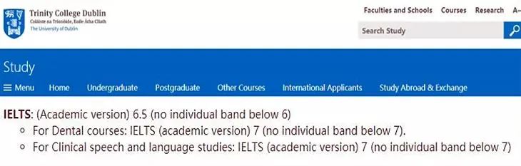 都柏林圣三一大学的普遍要求为雅思6.5分,但牙医和临床相关专业则需要不低于7分,且单科均不能低于7分。