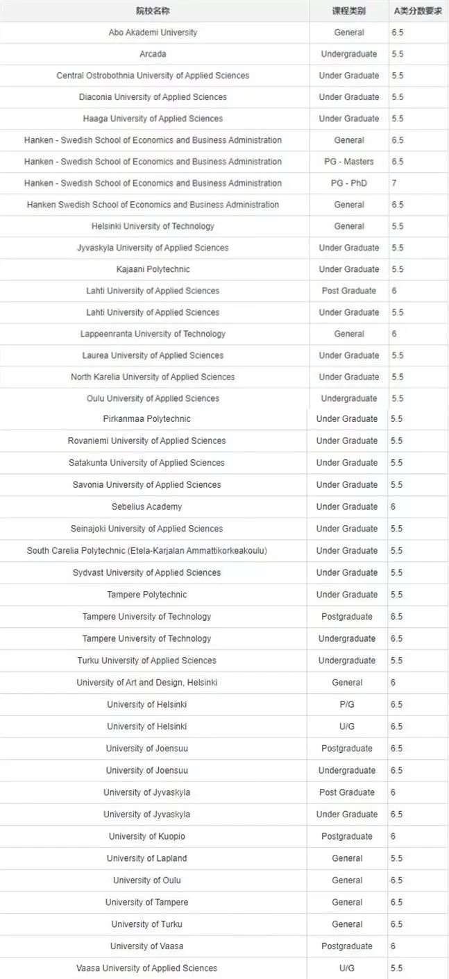 除了阿尔托大学以外,其他的大学普遍要求在雅思5.5-6.5分的水平。