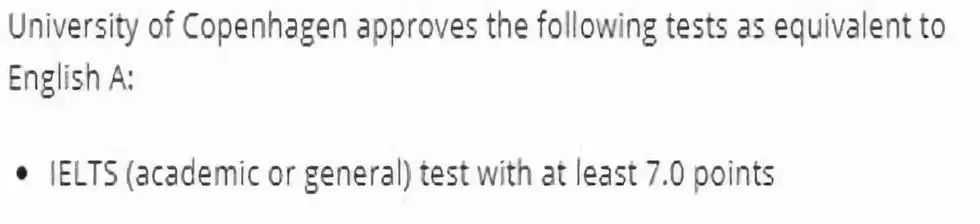丹麦学府对于英语授课课程的要求一般相当于丹麦English A的水平,也就是对等的雅思6.5-7分水平。以哥本哈根大学为例: