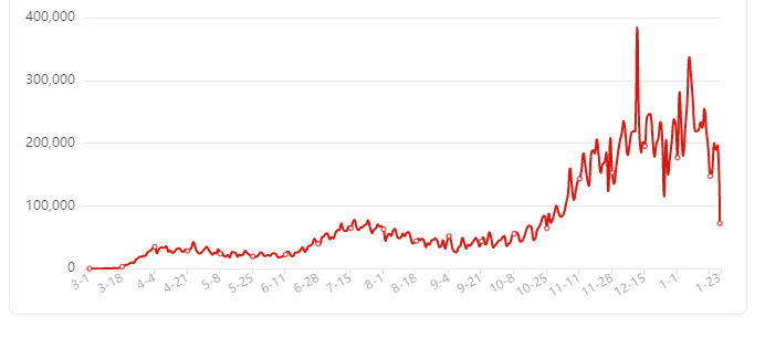 从1月17日开始,全美新增确诊人数,已经连续5天低于20万。相比前两周,已有大幅显著下降。