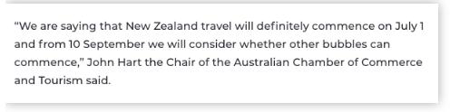 7月1日起,澳洲人可以出境了!第一批解封的国家是新西兰和太平洋岛屿国家,解封意味着可以在这些国家自由往来,无需隔离。澳大利亚商会和旅游协会主席约翰·哈特表示,“我很肯定地说,澳洲人被许可去新西兰旅游将在7月1日开始施行,在9月10日开始,我们将考虑是否陆续恢复其他国家地区的旅行。”