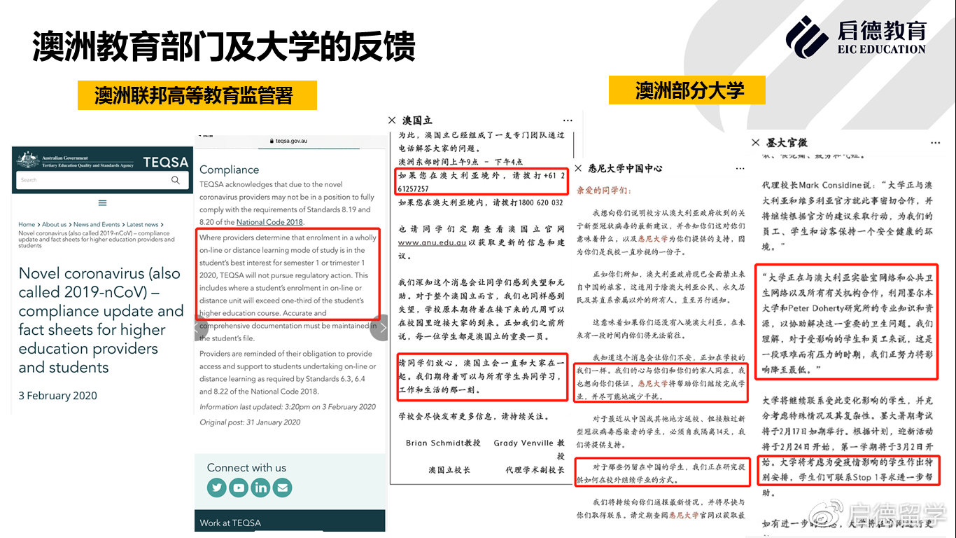 禁入令公布后,新西兰的和澳大利亚的教育部门都在第一时间积极迅速并且主动正面的反馈信息。澳洲联邦高等教育监管署2月3号发布声明:允许大学从学生利益最大化出发,对决定2020年第一学期采用线上或者是远程教学的机构,将不会因此给大学进行追责。
