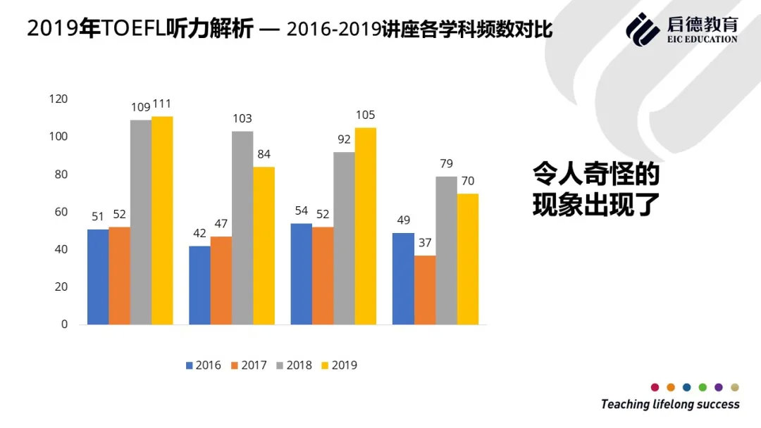 2019年托福综合写作相比2018年,完全讨论植物的话题考察很少,2019年改成了讨论整个生态系统的环境题目、出现了罕见的教育相关话题、出现了天文学题目、商业政策类话题的进一步增加。2019年托福独立写作教育类话题为重点考察题目,二选一题目频次基本没变,在六大题型中考频最高,单一观点题目有了显著的增加,出现了四选一题型;事实现象题锐减,绝对词题增加,其余基本变化不大。