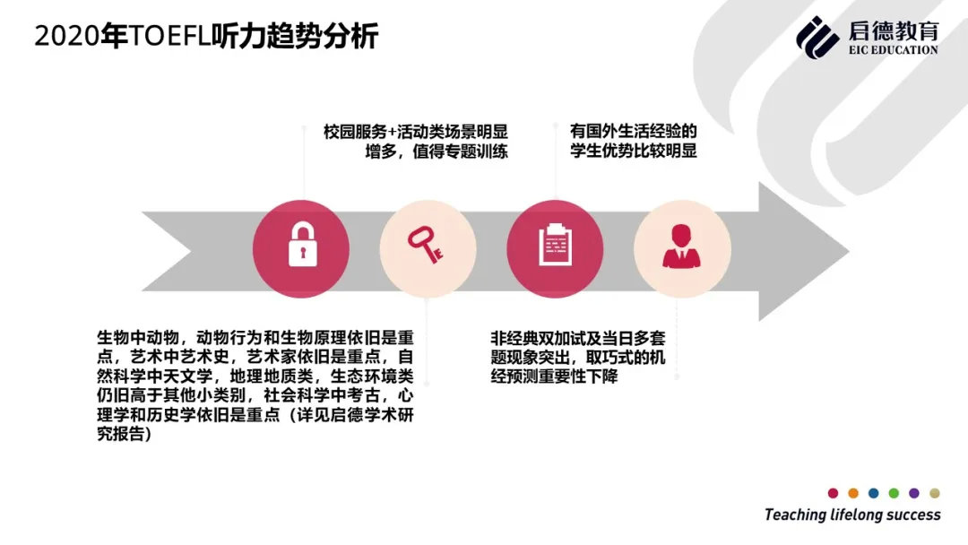 2020年托福独立写作生活方式类、教育类话题要重点关注、二选一题型仍为2020考查重点。2020托福阅读考试生物类和历史类话题仍为考查重点,社会类与考古类话题也要重点关注,从题型上分析,整体稳定但部分题型有波动,数量会减少但难度会上升。