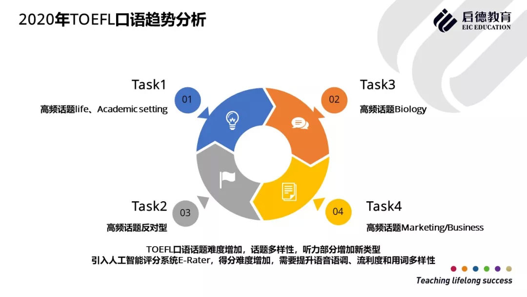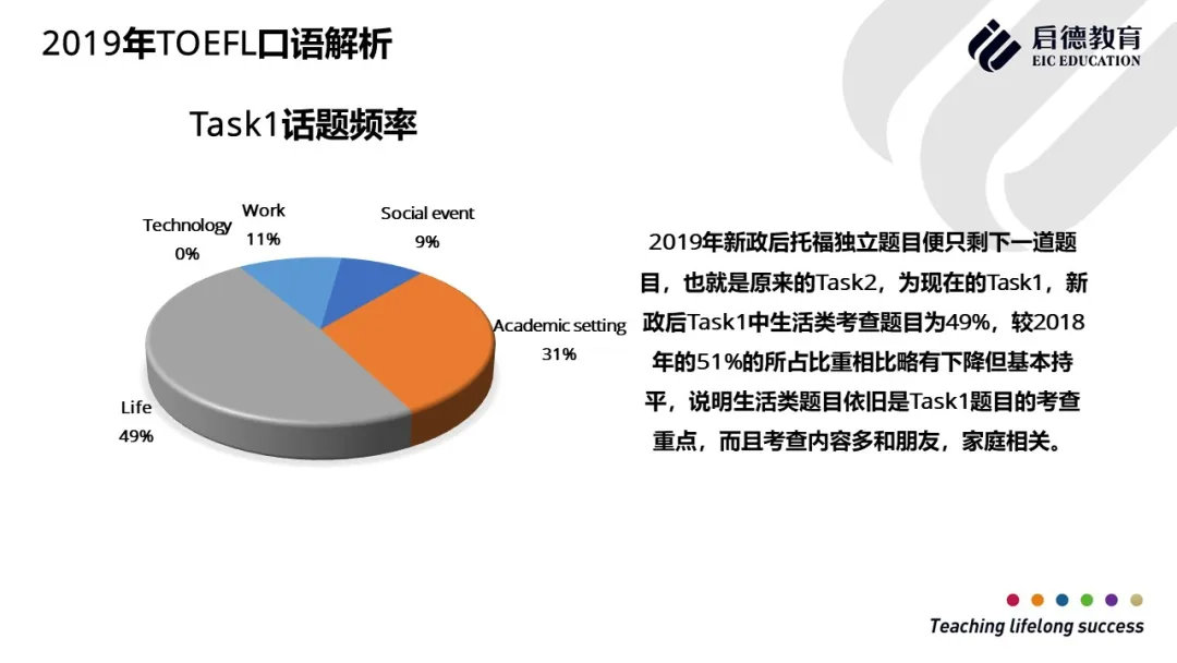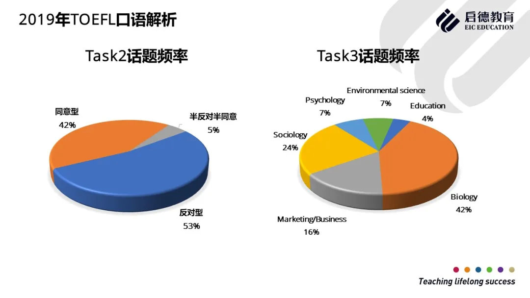 2019年托福口语考试Task1生活类考察题目比例为49%,较2018年略有下降,教育类话题2019年占比为31%, 2018年为32%,虽然2019年没有单独的科技类题目,但很多教育类别和生活类别的题目会涉及科技类内容,所以学生需要了解并运用科技的内容来回答这类口语题。托福口语Task2 校园类题目2019年与2018年相比,反对型占比下降,同意型比例上升,新增半反对半同意类题型,整体难度上升,对学生的细节掌握度要求更高。托福口语Task 3 生物类、社会类题目所占比重相比2018年有大幅提高,而商业类和心理类题目所占比重相比2018年有所减少。托福口语Task 4生物类、历史 类、心理类题目占比相比2018年有所减少,而商业类和环境科学类题目相比2018年有所上升。