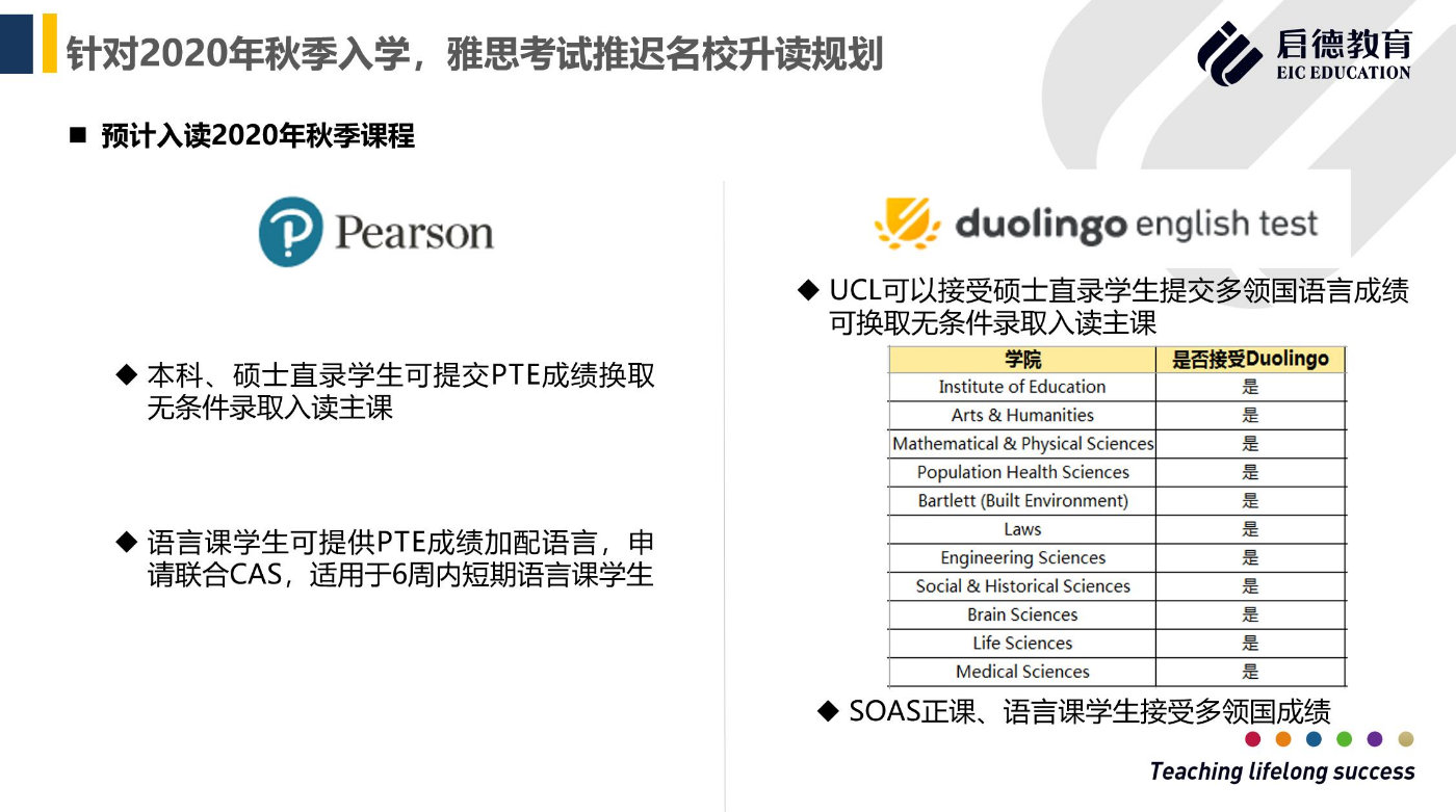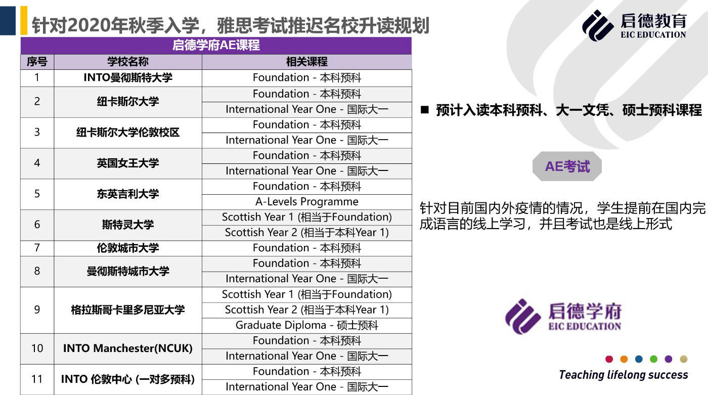 另一类学生是还没有雅思成绩,或者考过雅思但没有达到直录的条件,商蕊的建议是首先要寻求替代型考试,比如Duolingo、PTE、AE这些考试。现在大部分学校接受为语言加配的考试。启德学府的AE课程是与国外院校合作的学术英语课程,现在AE课程也可以通过线上进行,英国也有不少大学接受AE考试的成绩 。