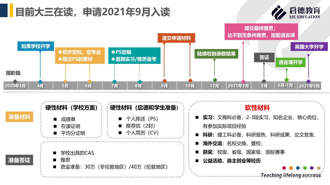 商蕊老师以目前在国内读大三的学生为例,规划了2021年秋季入学的申请时间表。英国大学申请开放时间早且采用先到先得的原则,所以也建议同学尽量赶第一波申请。计划明年秋季入学现在只有5个月的申请准备时间,应该立即着手联系留学顾问,定校、定专业、准备申请材料,比如成绩单、在读证明、平均分证明以、个人陈述、推荐信以及简历等。因此建议正在准备申请的同学,也要注意软实力的体现,这方面比较薄弱的同学也可以考虑通过一些项目来尽快弥补。比如启德的【善·任】项目可以帮助同学进入一些企业的核心岗位实习,远程的PTA项目也有丰富的选择。