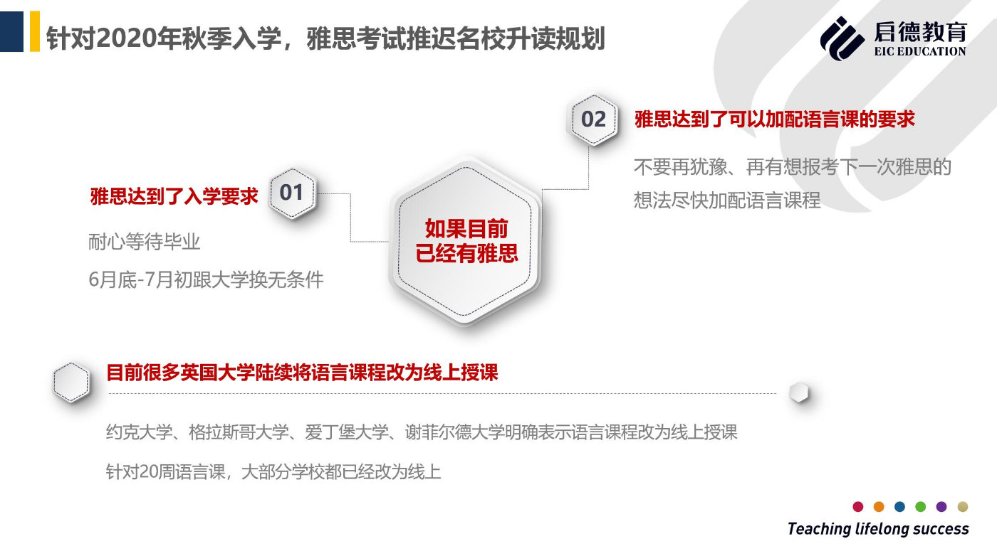 最近英国因为疫情的原因,很多英国大学都邮件通知启德,20周或者16周的语言课大部分改成了线上授课的模式。还有一些学校,比如杜伦大学的6周语言课和10周语言课也都全部改为线上授课。此外,像格拉斯哥大学、谢菲尔德大学、约克大学等线上课程开始接受报名。所以针对已经考过雅思而且雅思成绩已经达到可以加配语言课要求的同学,商蕊建议不要犹豫,尽快加配语言课。此外,商蕊也建议同学们考虑英国的硕士预科课程。语言课程在硕士预科课程中的占比大概是30%-40%,剩下50%以上的课程内容都与学术方面相关,对于一些想转专业的学生来讲,硕士预科是一个很好的选择。