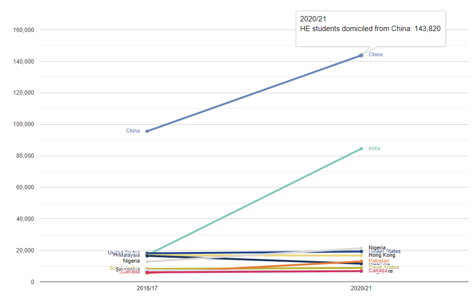 在英国的海外学生中,中国学生人数是最多的。2020/21 学年,32%的非欧盟学生来自中国,达到了143,820人。从2016/17至2020/21的五年期间,来自中国的学生人数增加了48,225人,上涨比例达到了50%。