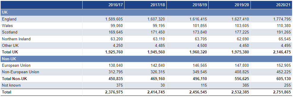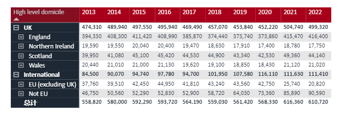 据HESA数据显示,在2020-2021学年,英国高等教育累计人数达到了 2,751,865,较前一年上涨9%。其中非英国学生总数达到了605,130,同比前一年上涨8%。