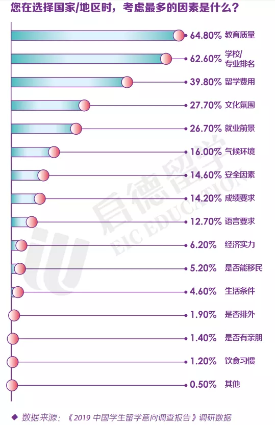 从《中国学生留学意向调查报告》的数据来看,大家考虑最多的就是教育质量,学历含金量和费用问题。