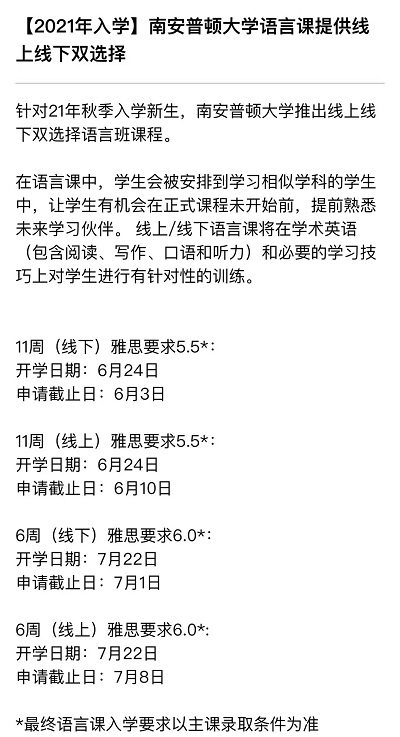 南安普顿大学通知针对2021年秋季入学,推出线上线下双选择的语言课程,具体请看官网:https://www.southampton.ac.uk/courses/pre-sessional-language-courses.page