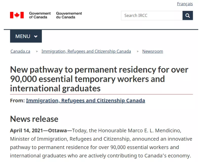 加拿大移民,难民和公民事务部长Marco E. L. Mendicino于2021年4月14日,宣布了一条创新(超低门槛)的永久居留权申请途径,该途径将开设90,000个永居名额,专门设给为加拿大经济做出贡献的重要工人和国际毕业生。 该创新移民项目计划将于2021年5月6日开通, 且设有三个类别,其中一项类别就针对于在加拿大院校毕业的国际留学生。